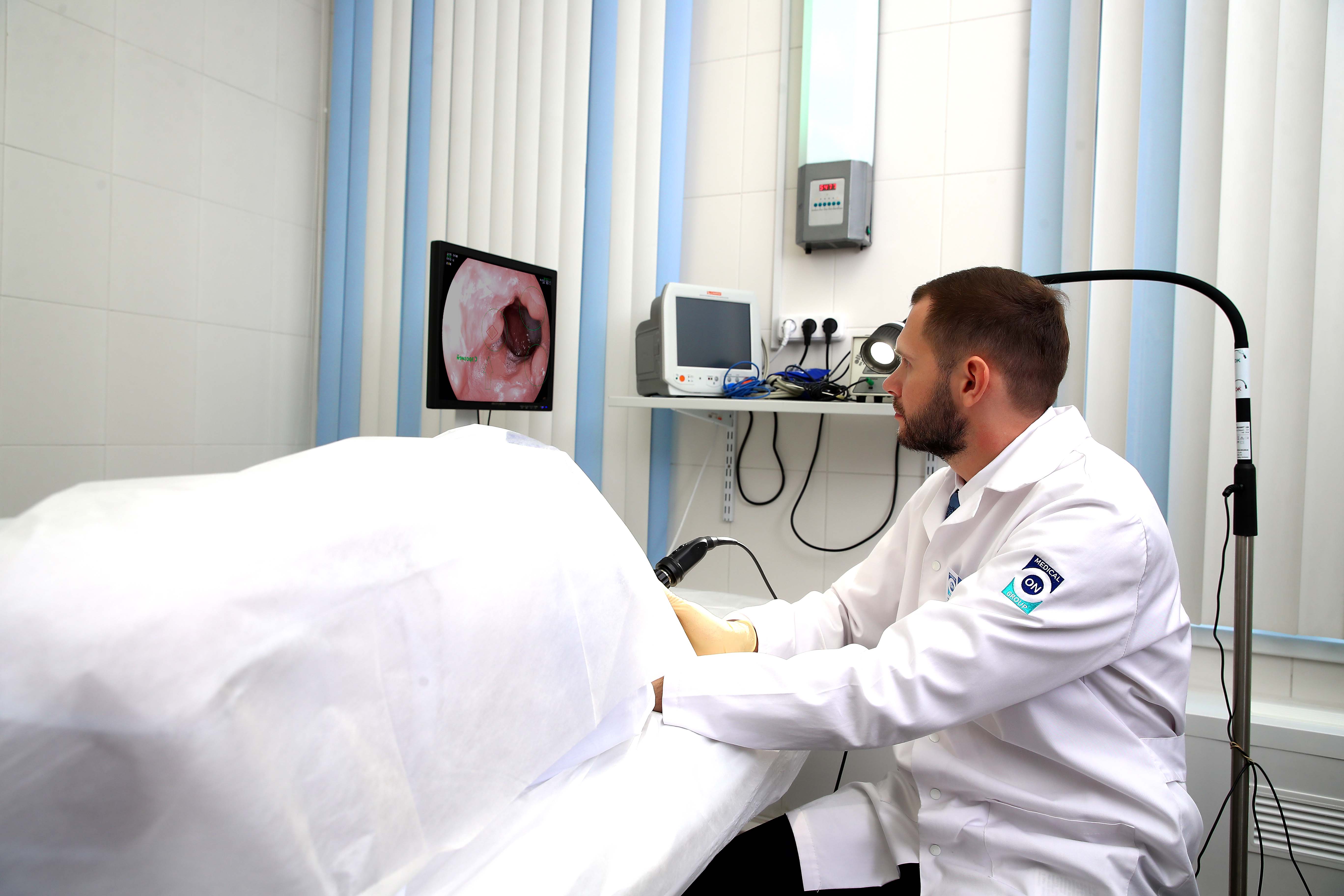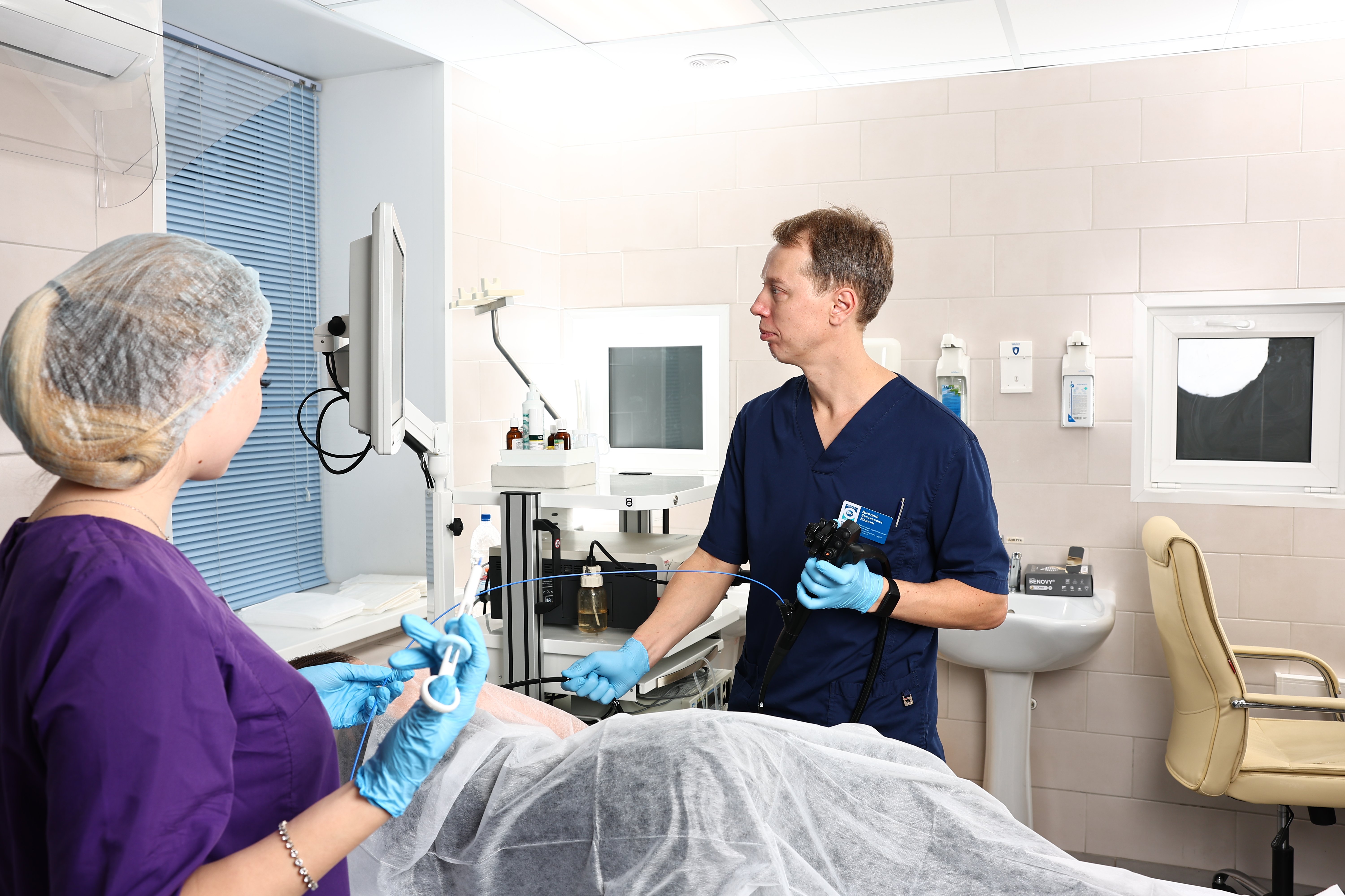 Заведующий эндоскопическим отделением, врач хирург-колопроктолог, эндоскопист Маркин Д.Е. проводит эндоскопическое исследование