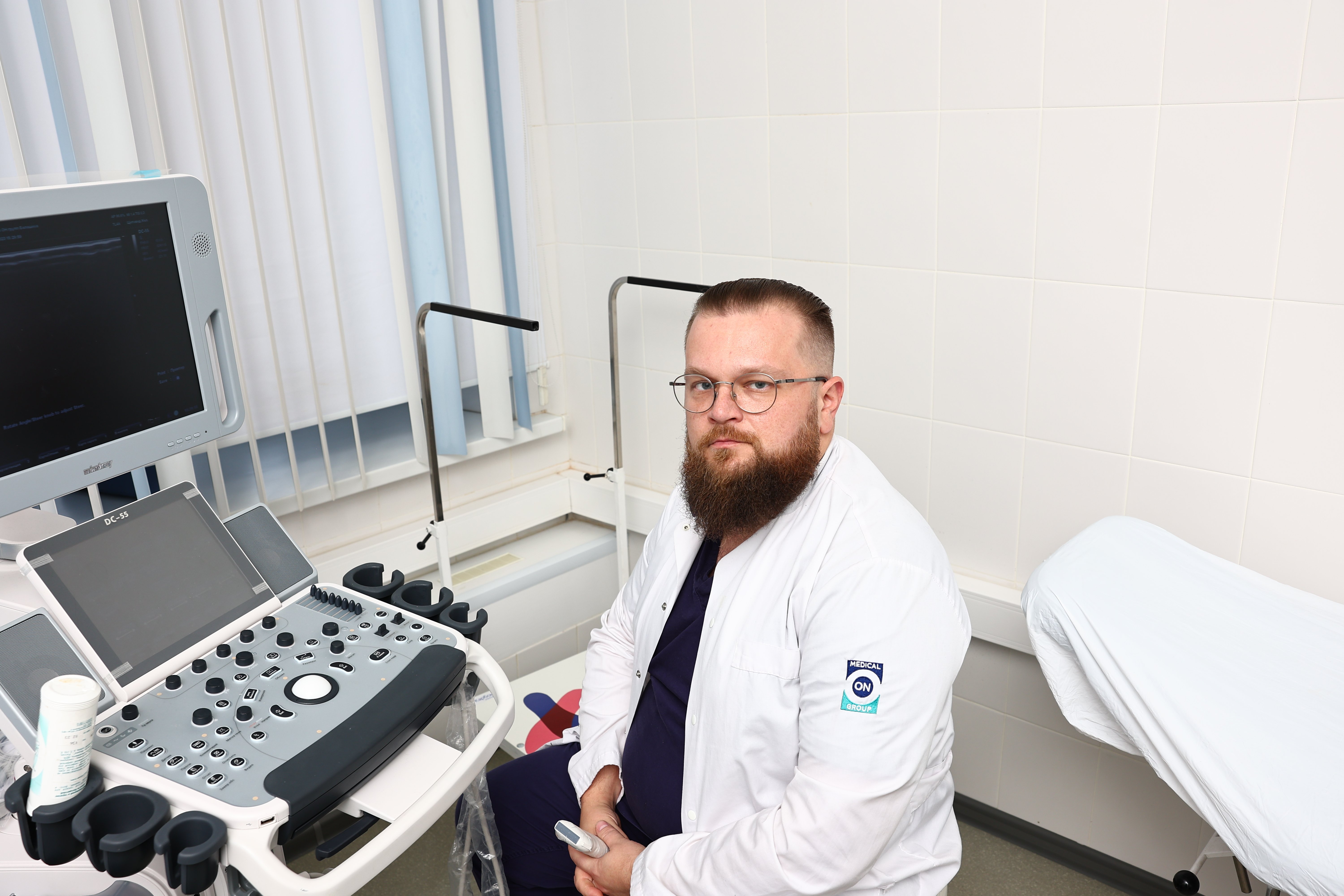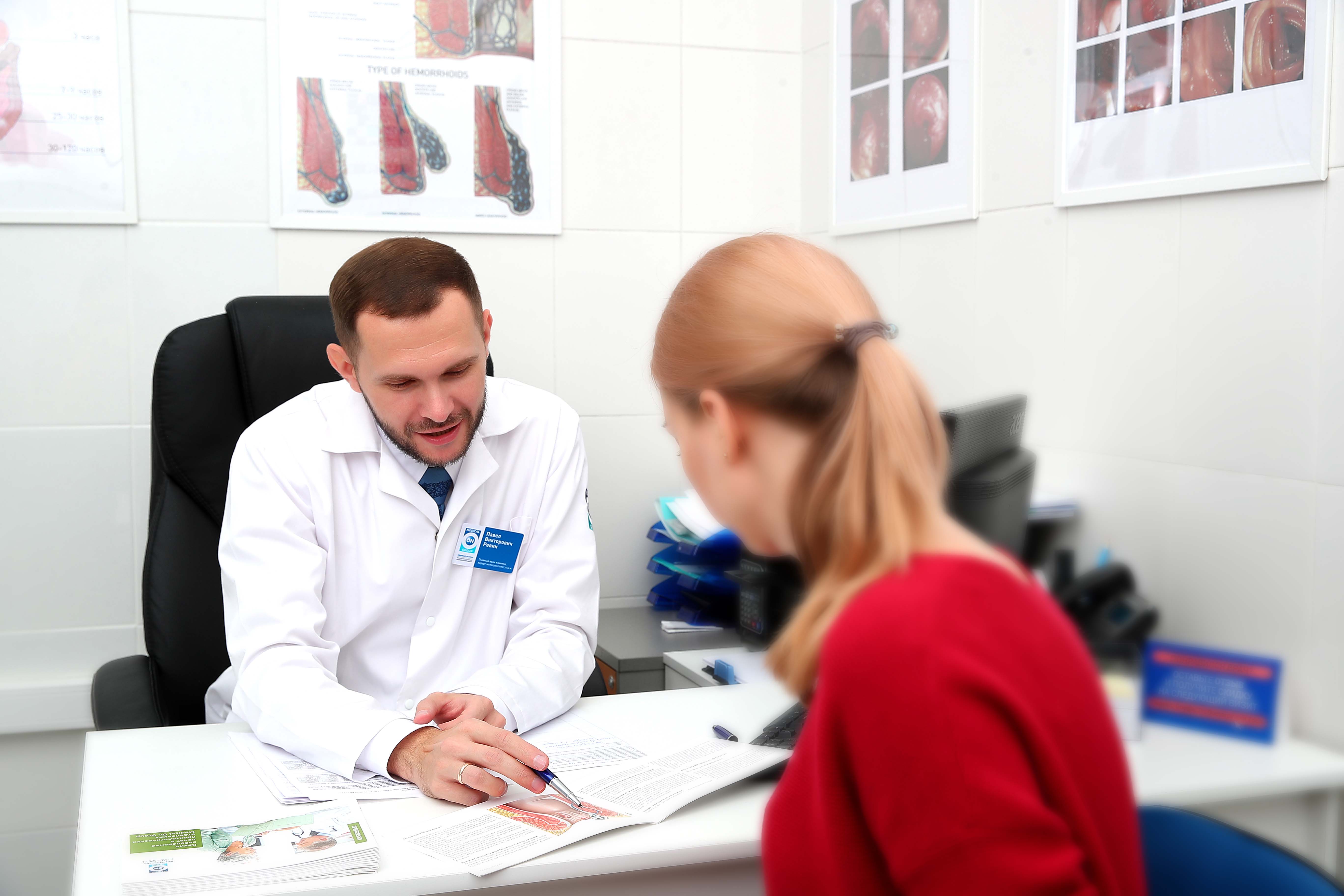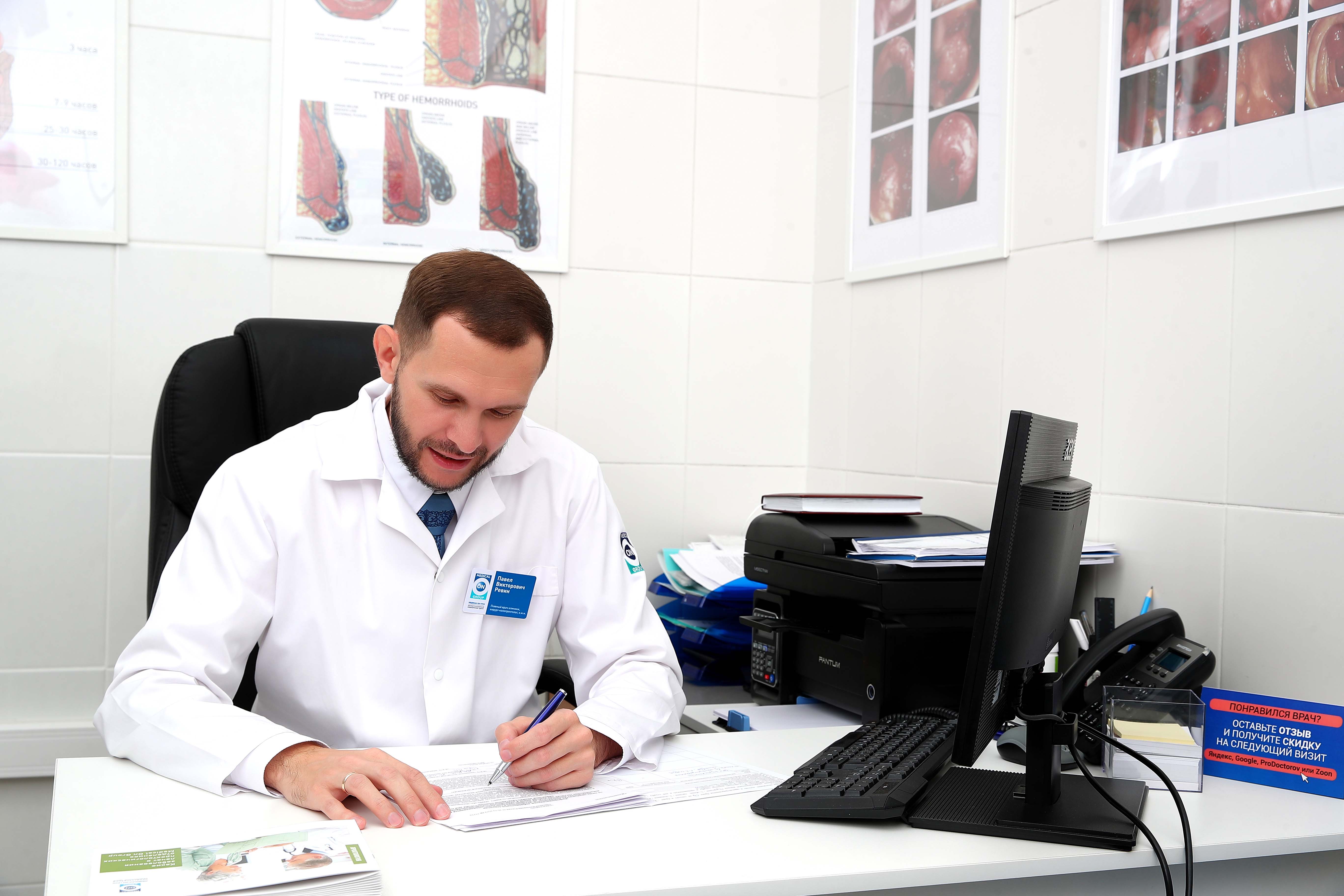 Главный врач клиники, колопроктолог, хирург Ревин П. В. проводит осмотр пациента