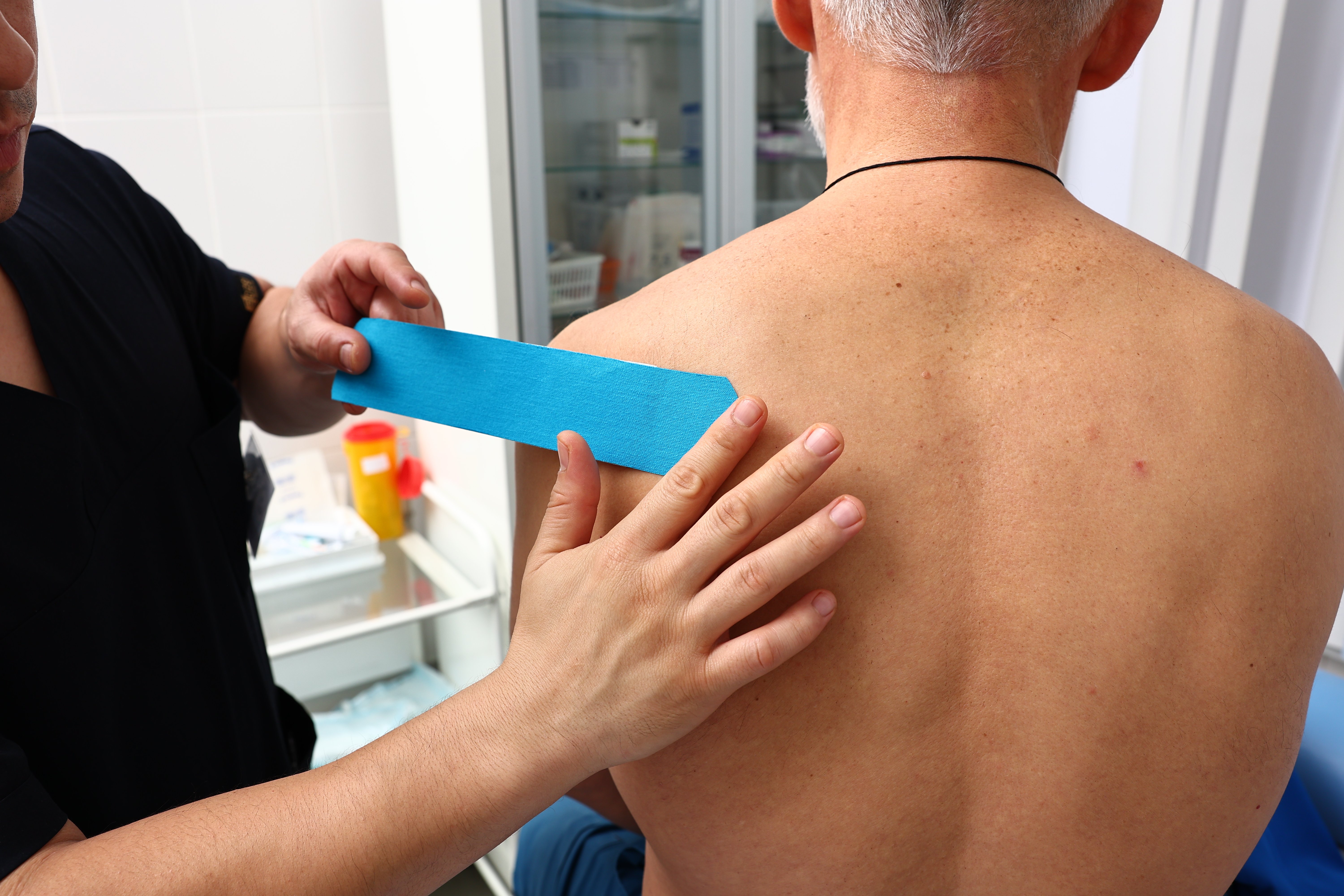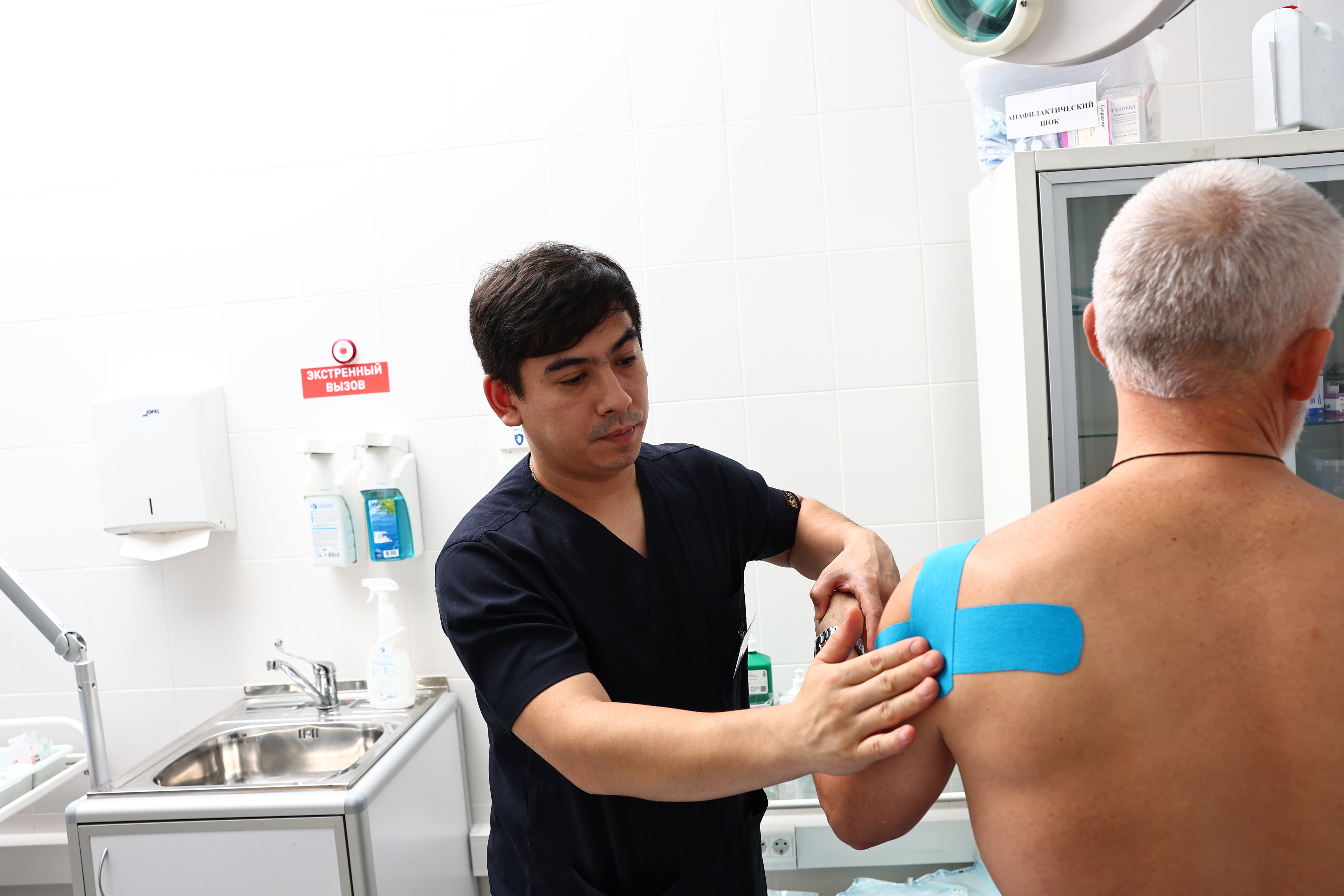 Специалист по массажу, гирудотерапевт Пак Д.В. накладывает кинезиотейпы