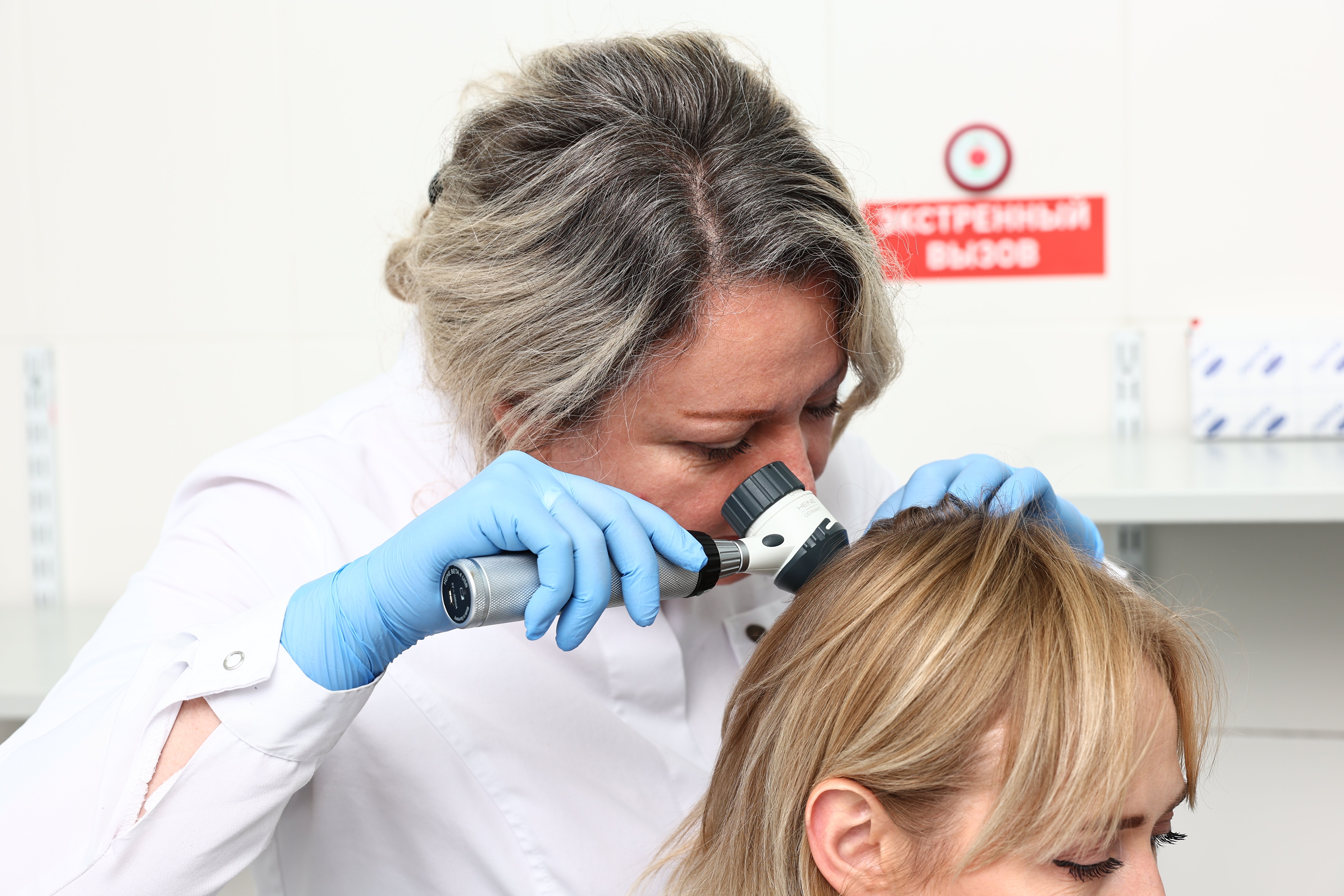 Врач-дерматовенеролог, косметолог, трихолог Юнек С.А. проводит осмотр пациента